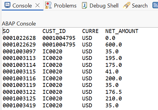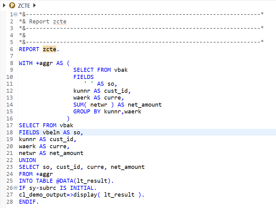 WITH cte_sales AS ( SELECT FROM vbak FIELDS vbeln, kunnr, erdat WHERE erdat >= @lv_from_date ), cte_items AS ( SELECT FROM vbap FIELDS vbeln, SUM( netwr ) AS amount, COUNT( * ) AS items GROUP BY vbeln ) SELECT FROM cte_sales AS s INNER JOIN cte_items AS i ON i.vbeln = s.vbeln FIELDS s.vbeln, s.kunnr, i.amount, i.items INTO TABLE @DATA(result).