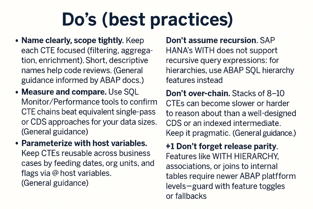 - Name clearly, scope tightly. Keep each CTE focused (filtering, aggregation, enrichment). Short, descriptive names help code reviews. (General guidance informed by ABAP docs.)